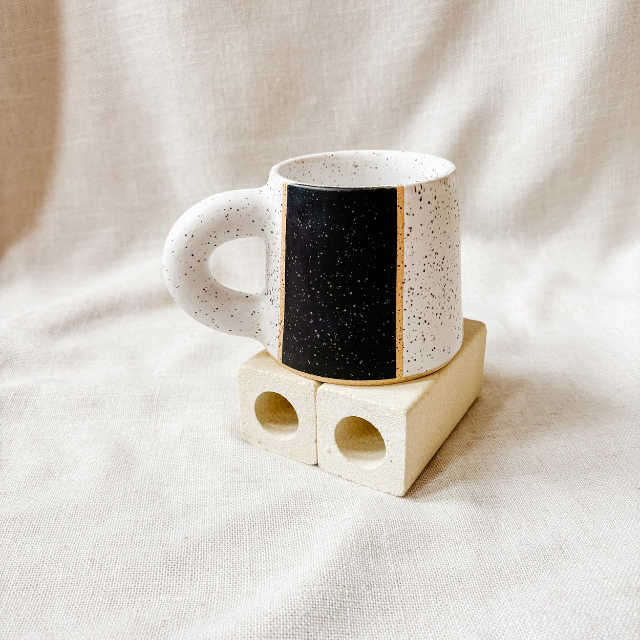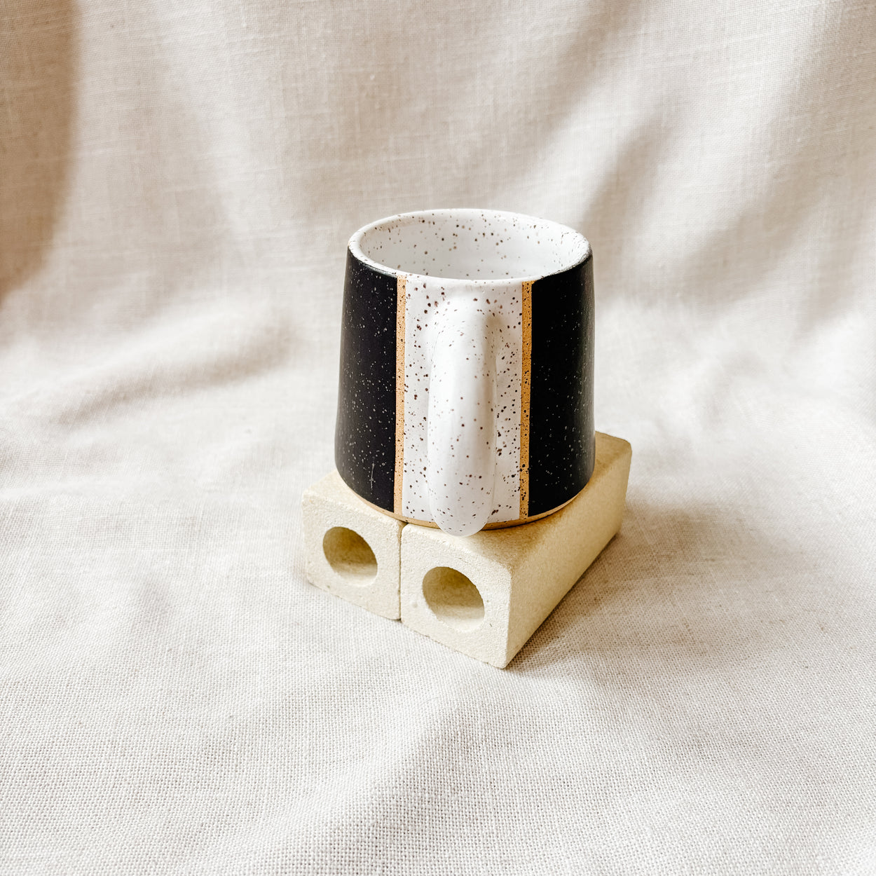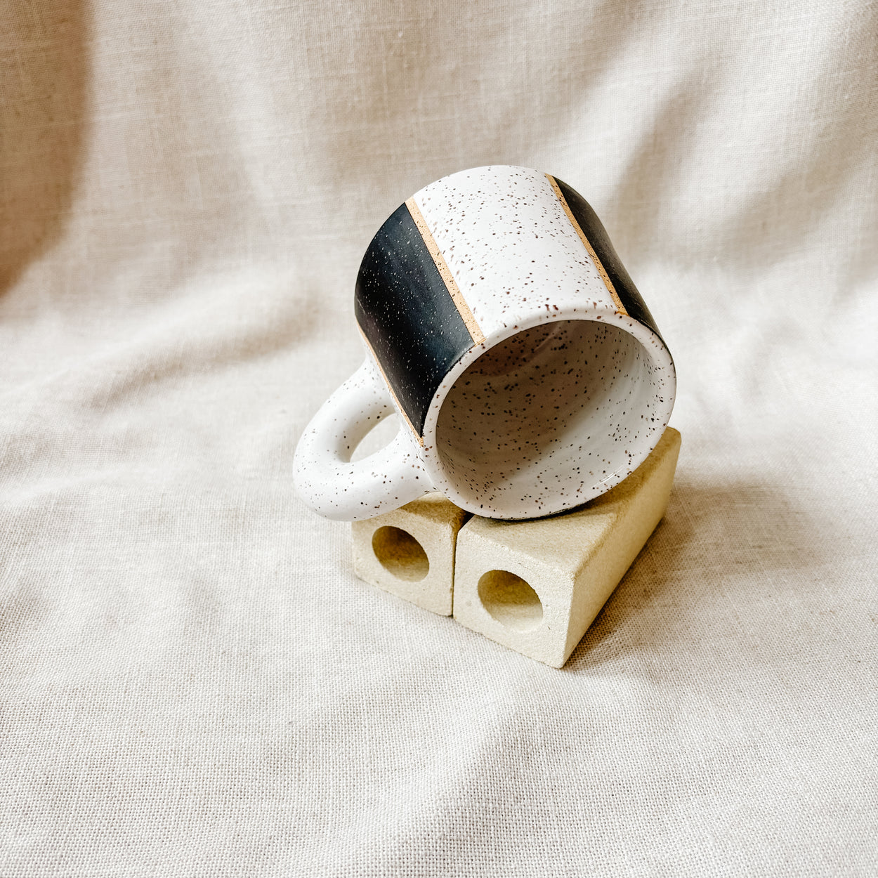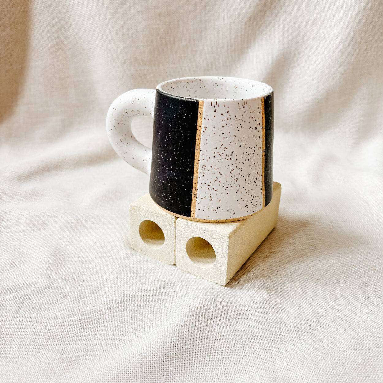 Alternating matte black and glossy white stripes. The contrasting glazes feel lovely in your hand. This piece is one of a kind.