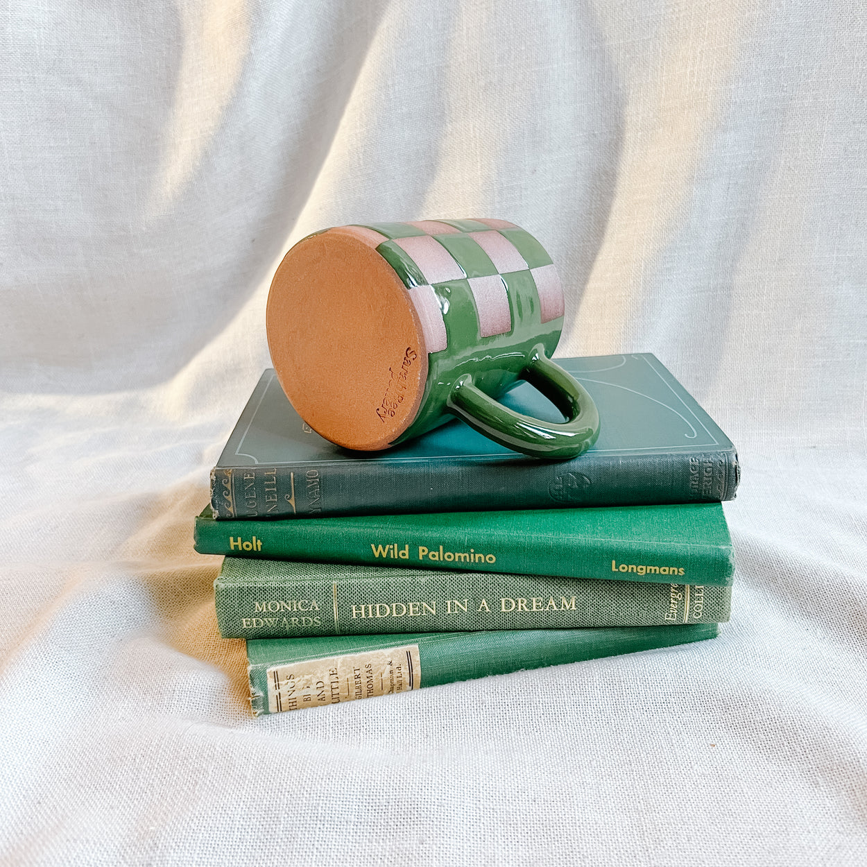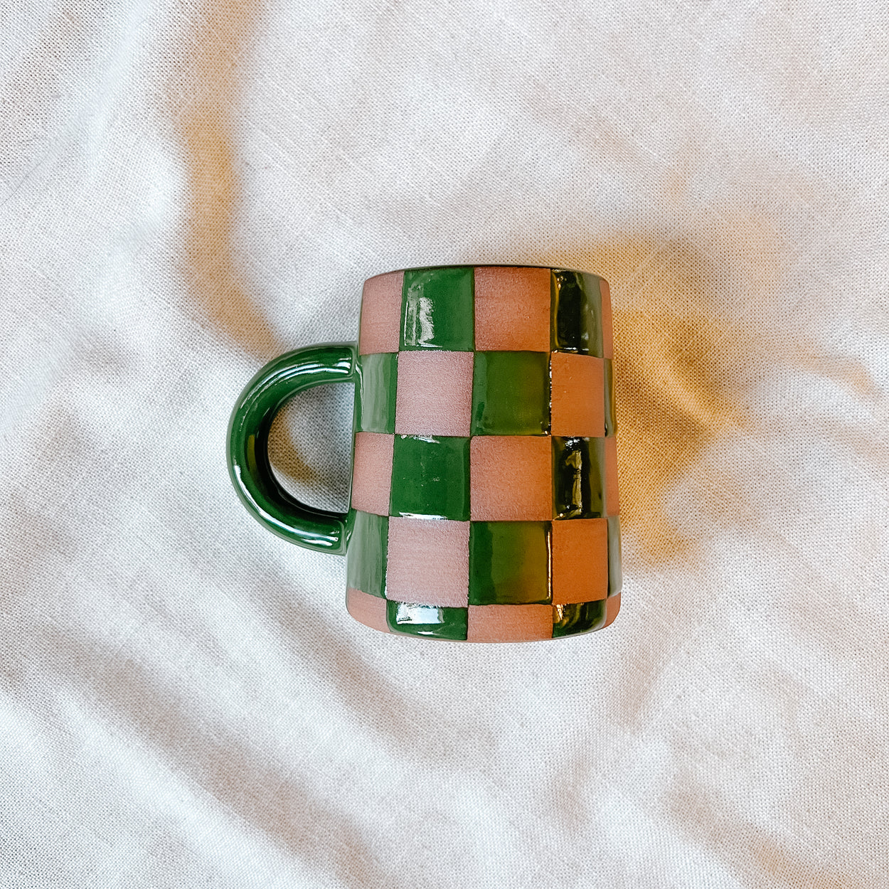 Wheel thrown mug, made from red clay and glazed a glossy dark green. The checkered print has exposed unglazed clay which may feel rough to some, please take this into consideration if you are sensitive to texture. The base is unglazed and sanded smooth.