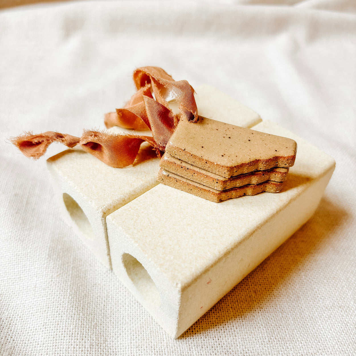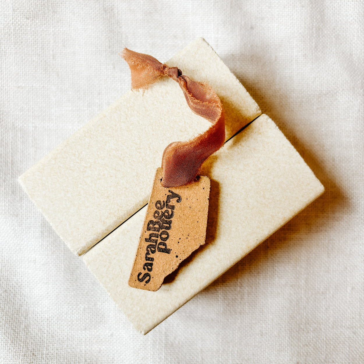 All individual ornaments come with a storage box. The base of the ornament is raw clay stamped with the SarahBeePottery makers mark.