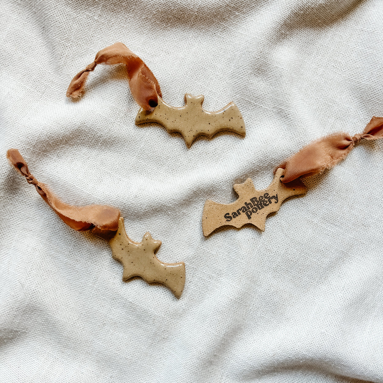 All individual ornaments come with a storage box. The base of the ornament is raw clay stamped with the SarahBeePottery makers mark.