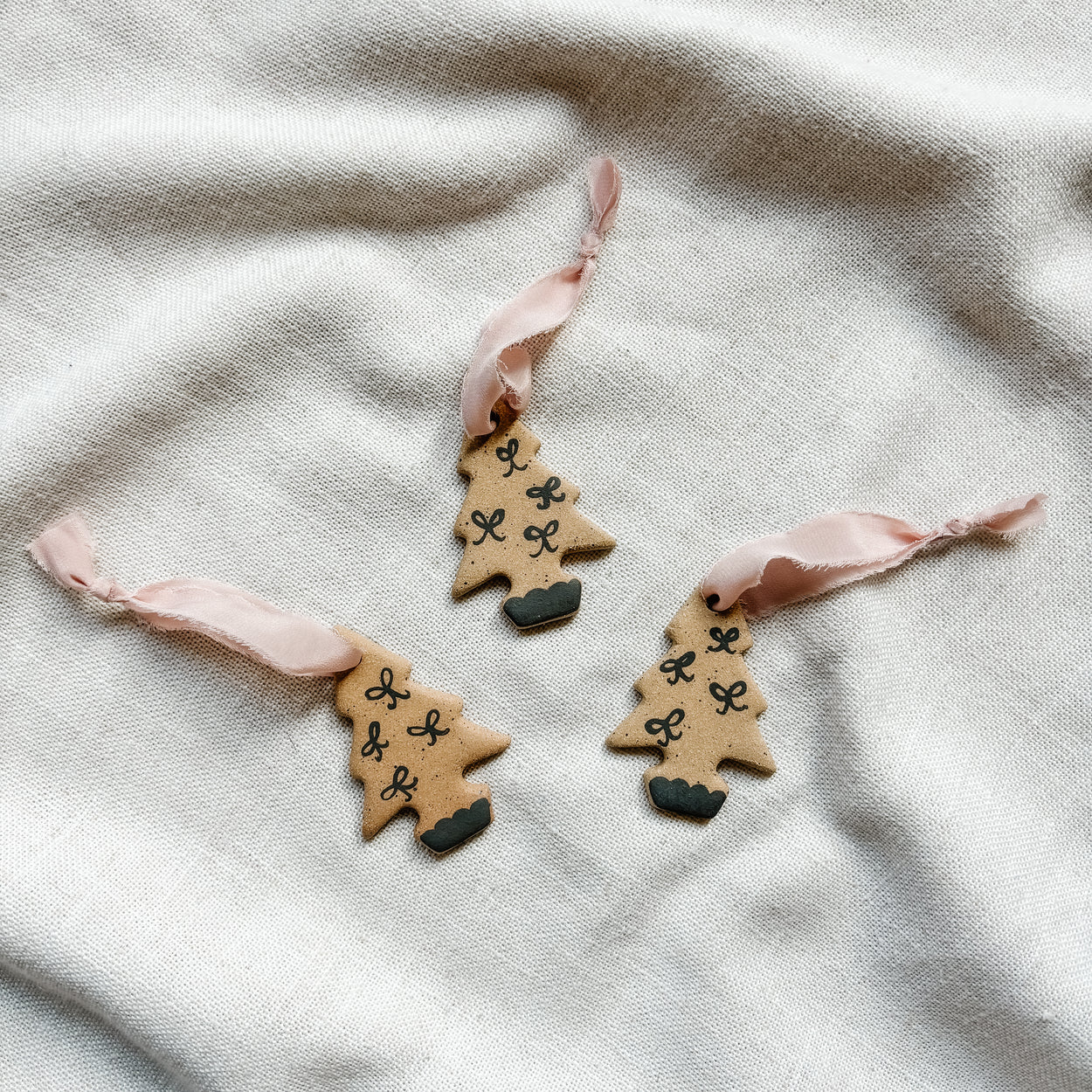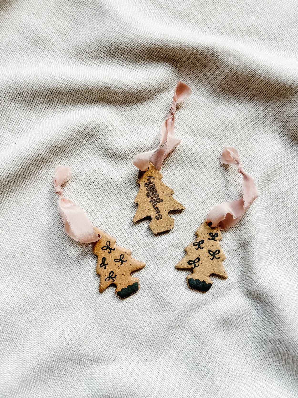 All individual ornaments come with a storage box. The base of the ornament is raw clay stamped with the SarahBeePottery makers mark.