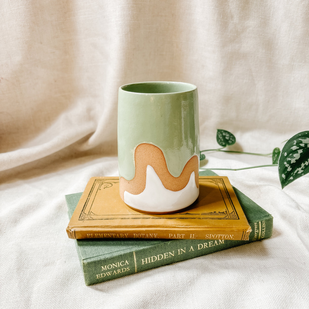 Decorative Features: Exposed clay wavy stripe around the base of the cup creating a green and white colour blocking situation