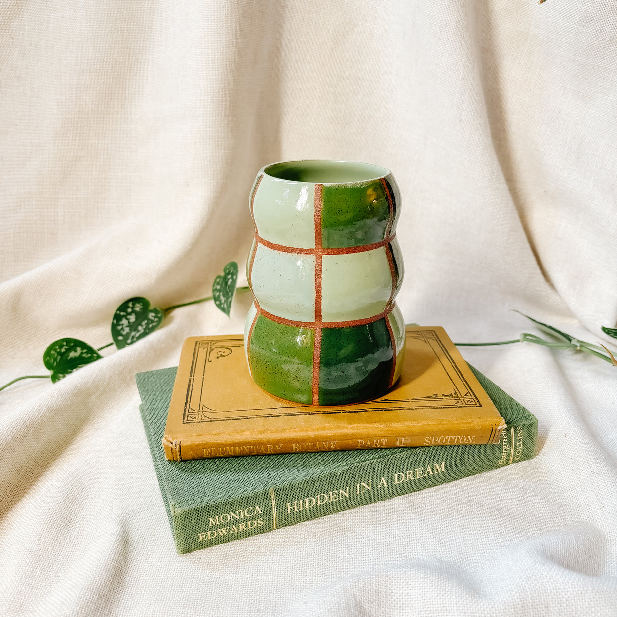 Decorative Features: Multi-Colour grid pattern around a wavy cup, featuring every shade of green glaze I have in the studio.