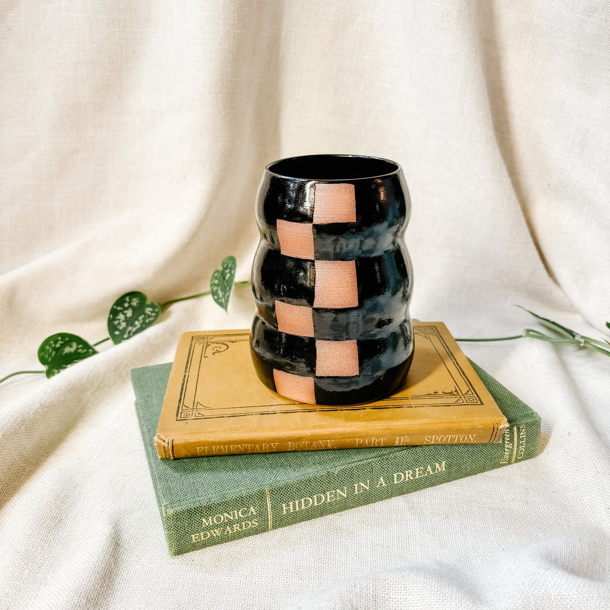 Decorative Features: Exposed clay and black checkerboard pattern on each side of the cup.