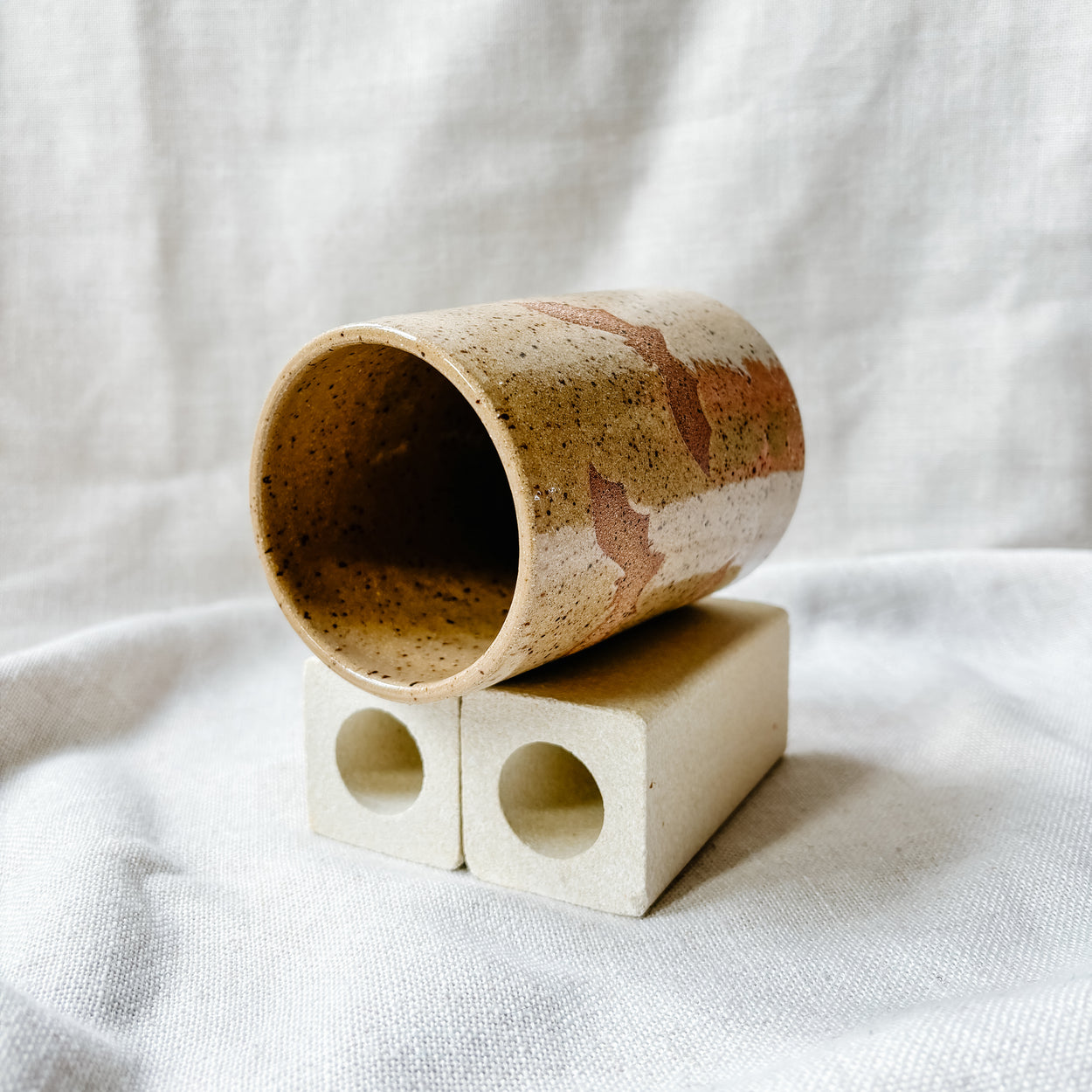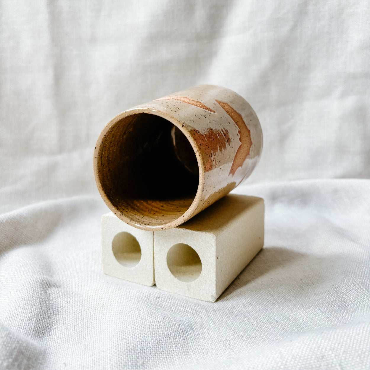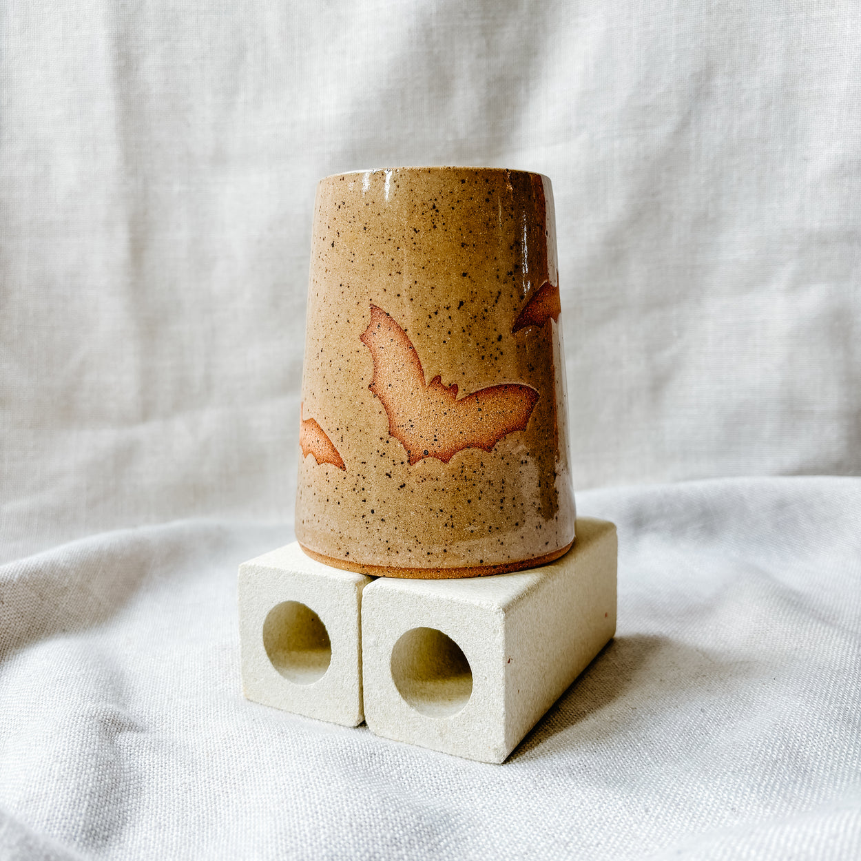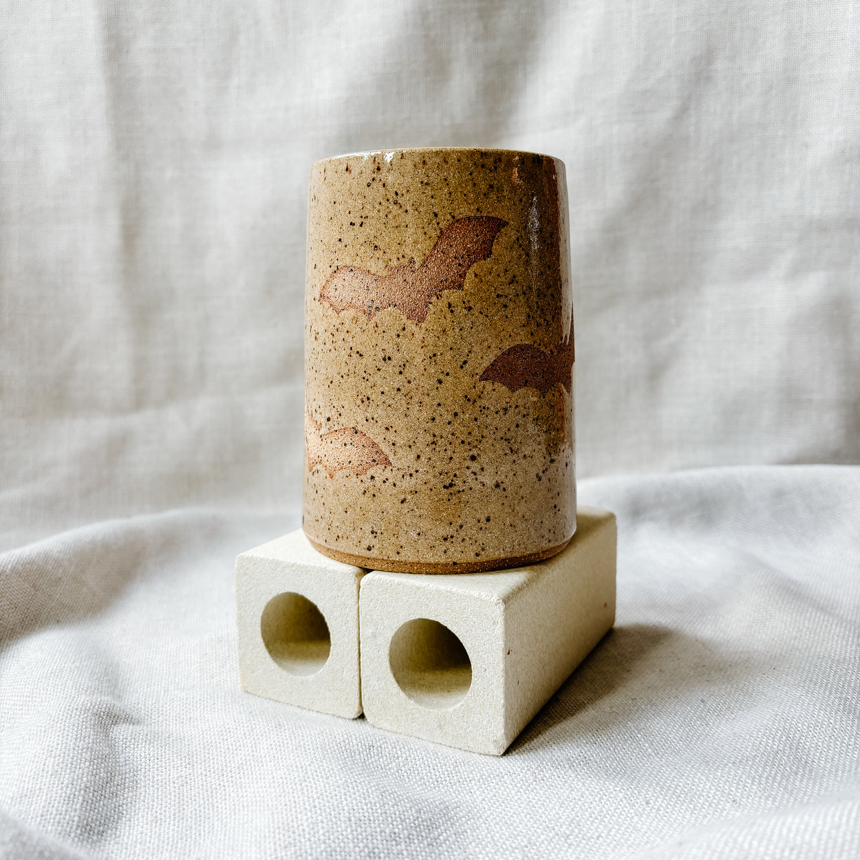 PLEASE READ: This cup is not one of a kind, there are multiples available and each cup will vary. The exact bat size and placement is slightly unique per cup. Additionally, this clay is pretty magical and reacts to slight changes in temperature during the firing, each firing is unique and as a result there is a varying level of toastiness in each cup. It’s really what makes these extra special but if this doesn’t sound like something you’d like that’s ok!