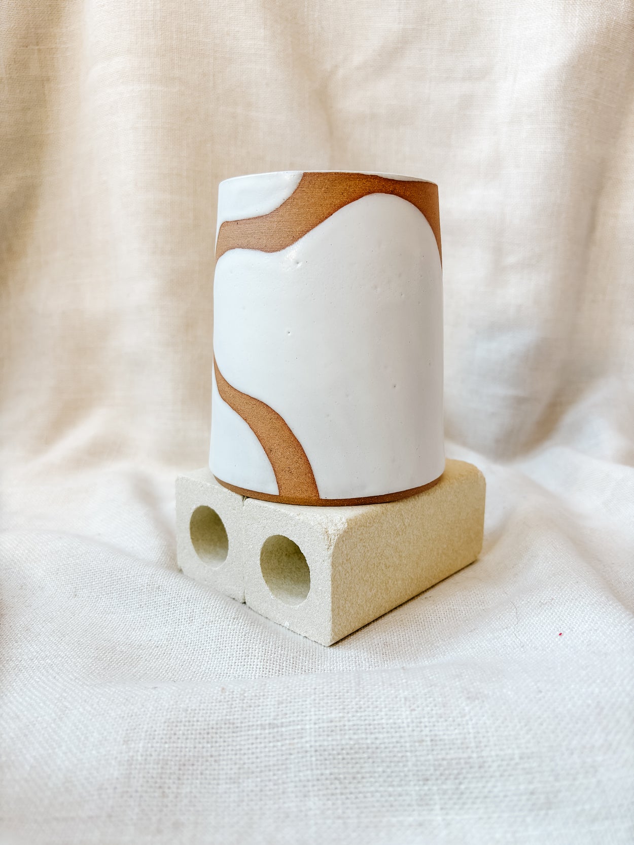 A wheel thrown cup, made from a smooth dark stoneware clay, glazed matte white with exposed clay wavy pattern on the exterior.