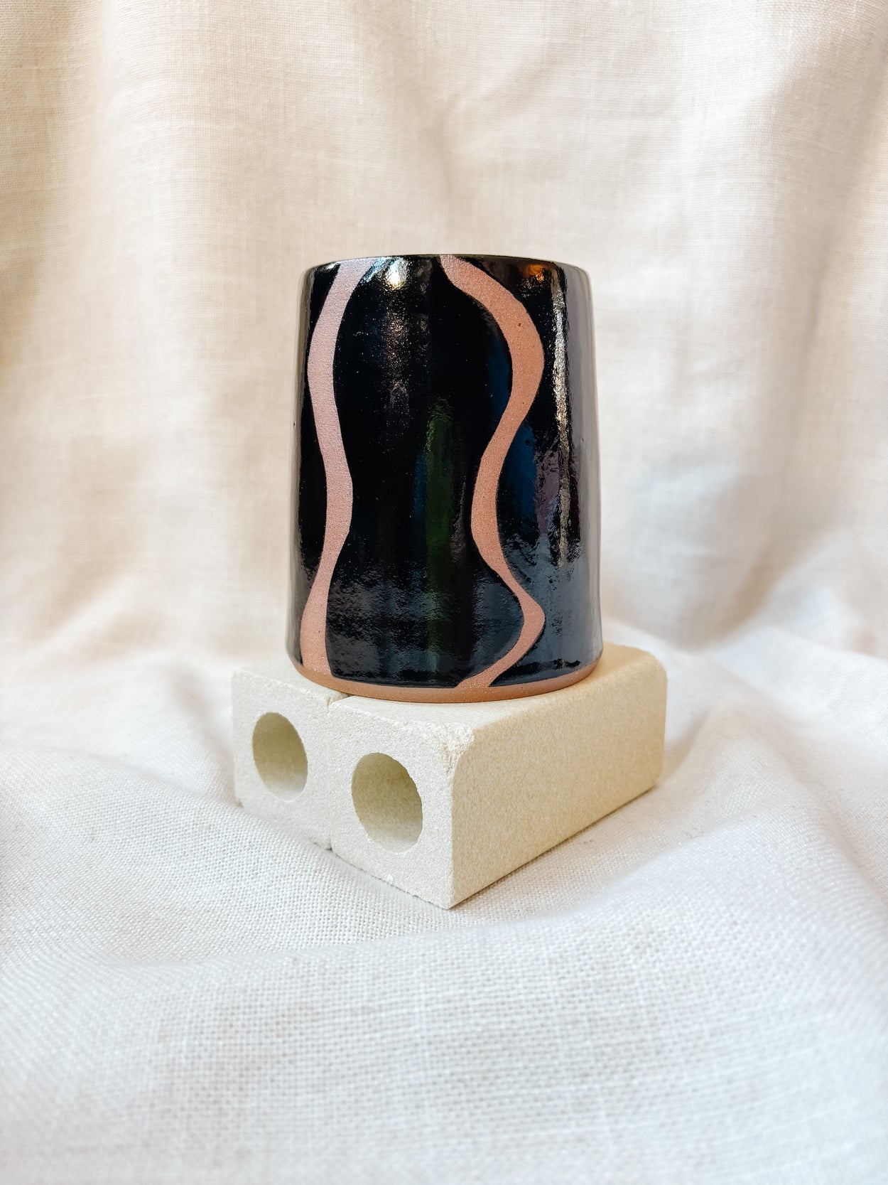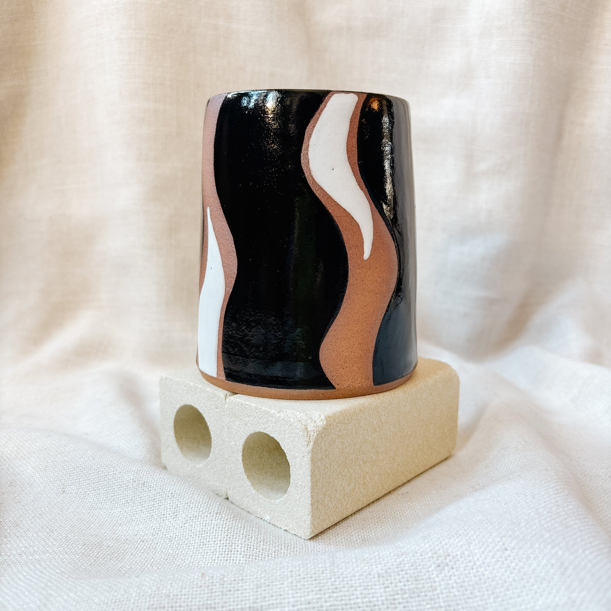 A wheel thrown cup, made from a smooth dark stoneware clay, glazed glossy black on the exterior and interior. The front of the cup features a wavy abstract pattern with two matte white apparitions.