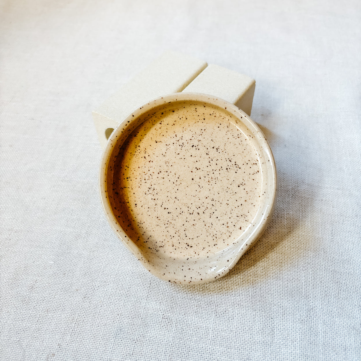 One wheel thrown spoon rest, made from speckled clay and transparent glossy glaze , unglazed base. The base will be sanded smooth to protect any household surfaces, use on counter recommended.