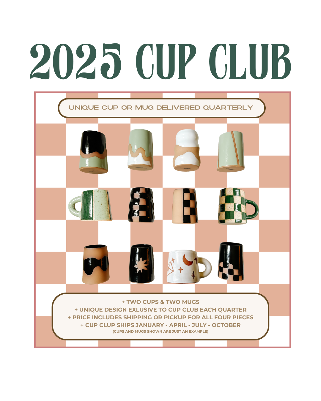 Cup Club is discounted as a thank you for paying up front and committing to the year of surprises with me! If you already know you like my colour blocking/checkered/raw clay/sometimes abstract style then it’s a great way to get four pieces at a lower price than usual.