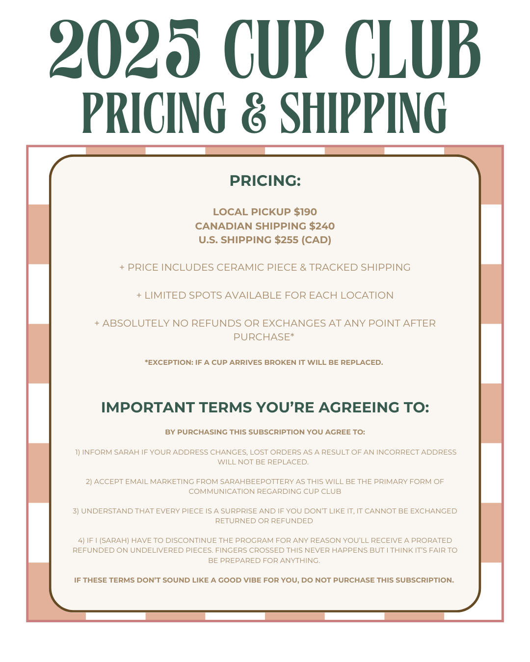 2) ACCEPT EMAIL MARKETING from SarahBeePottery for the entire duration of Cup Club as this will be my primary form of communication regarding cup club including tracking information for your order.