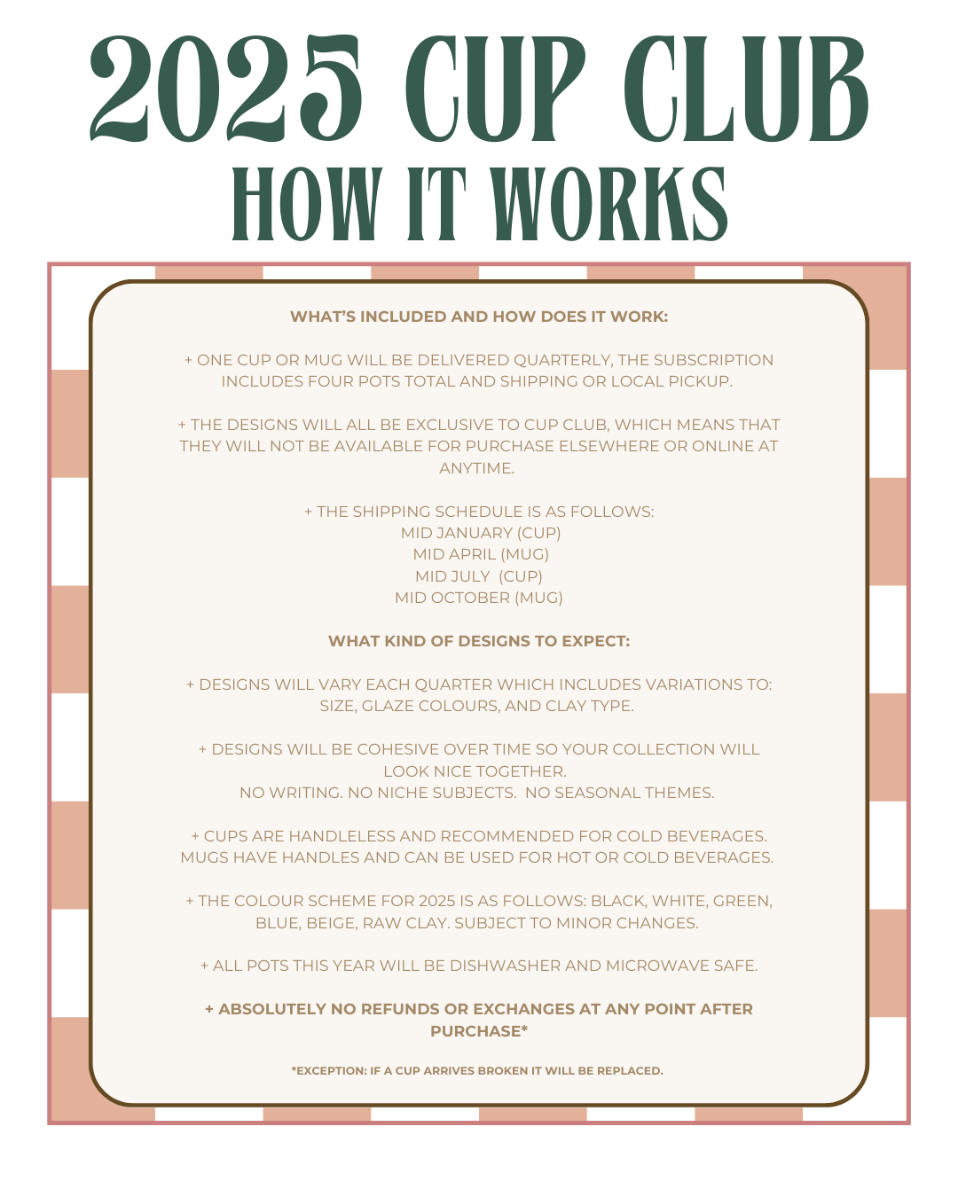 + One cup or mug will be delivered quarterly (every three months). The subscription includes four pots total and shipping or local pickup.